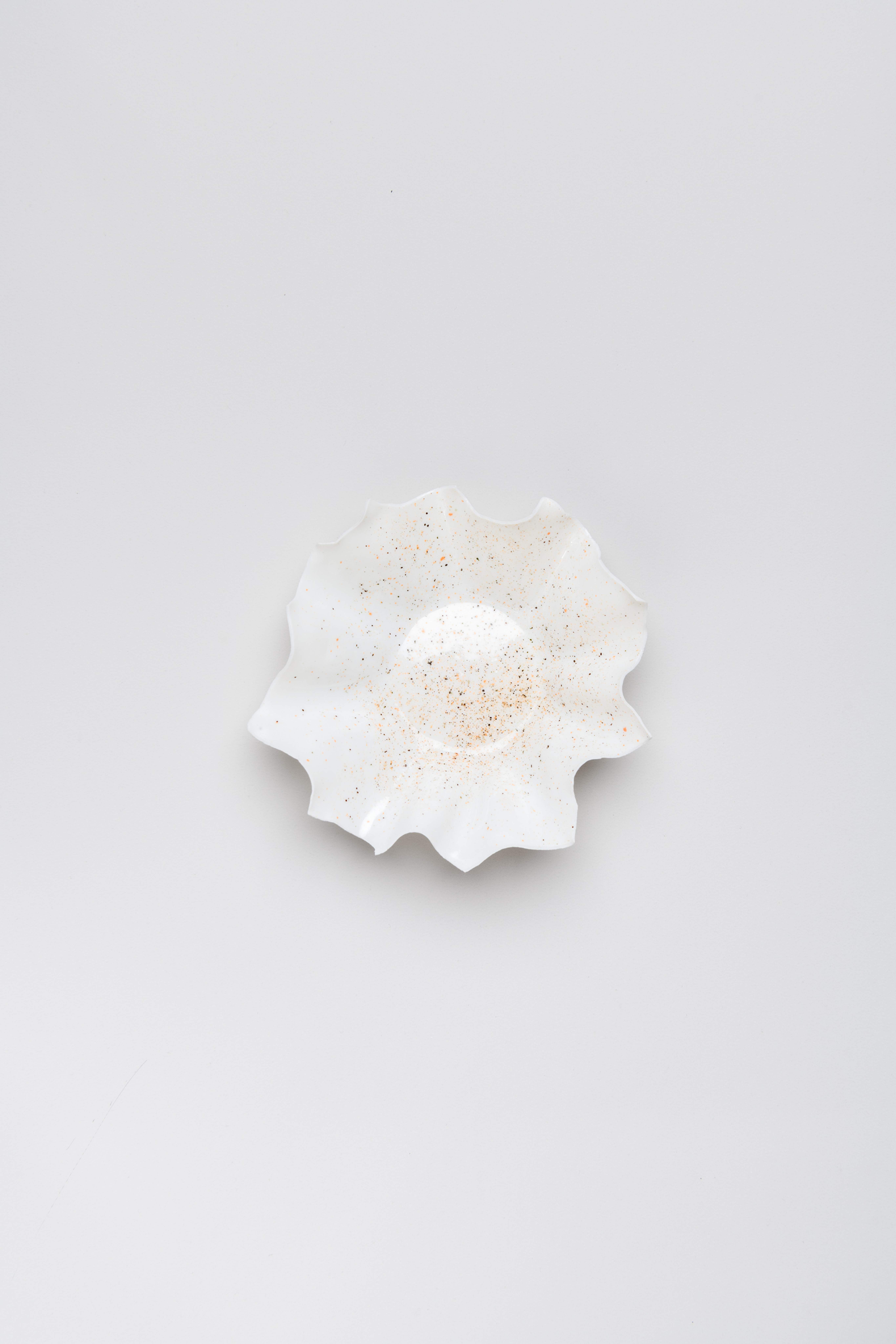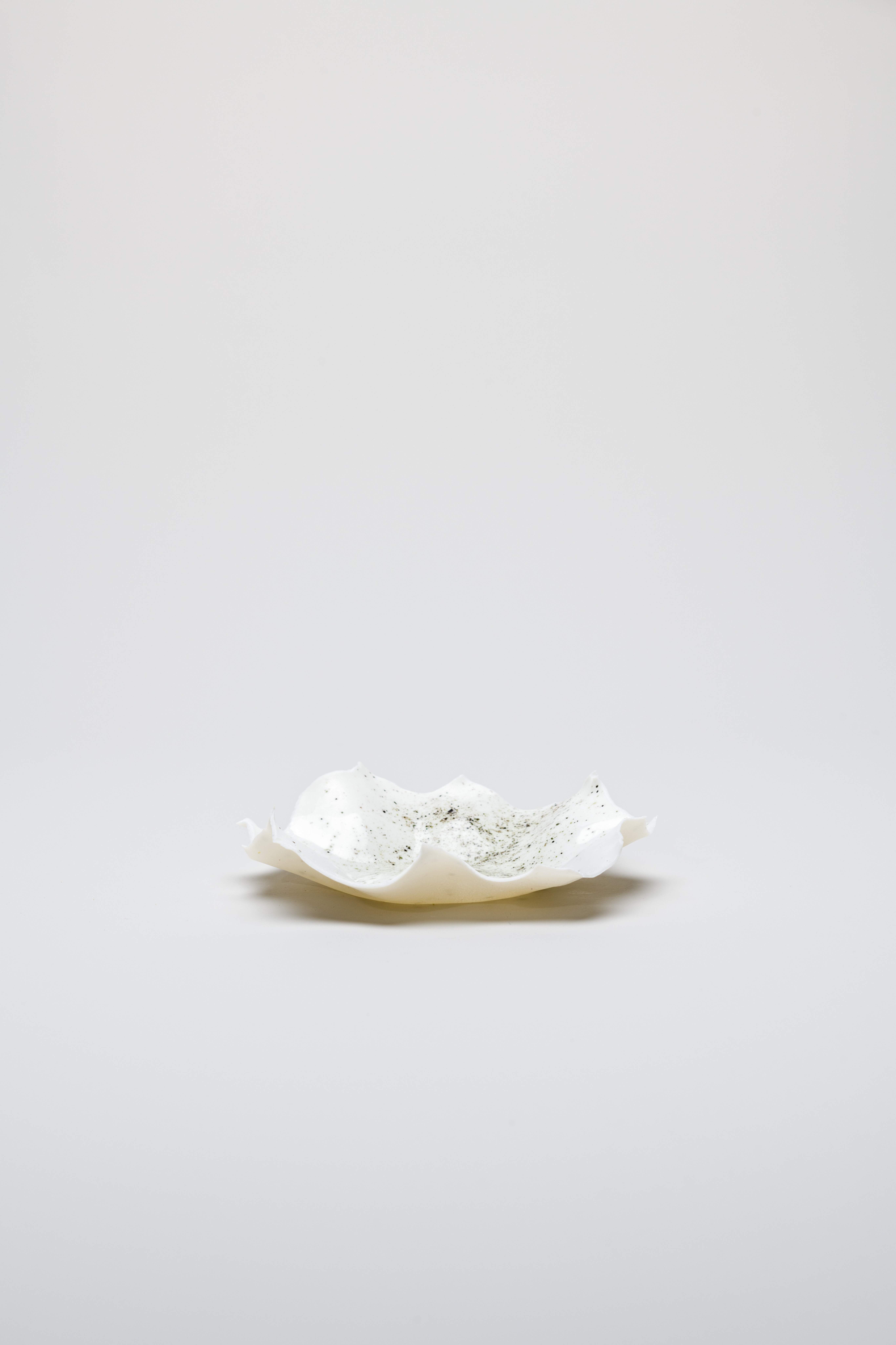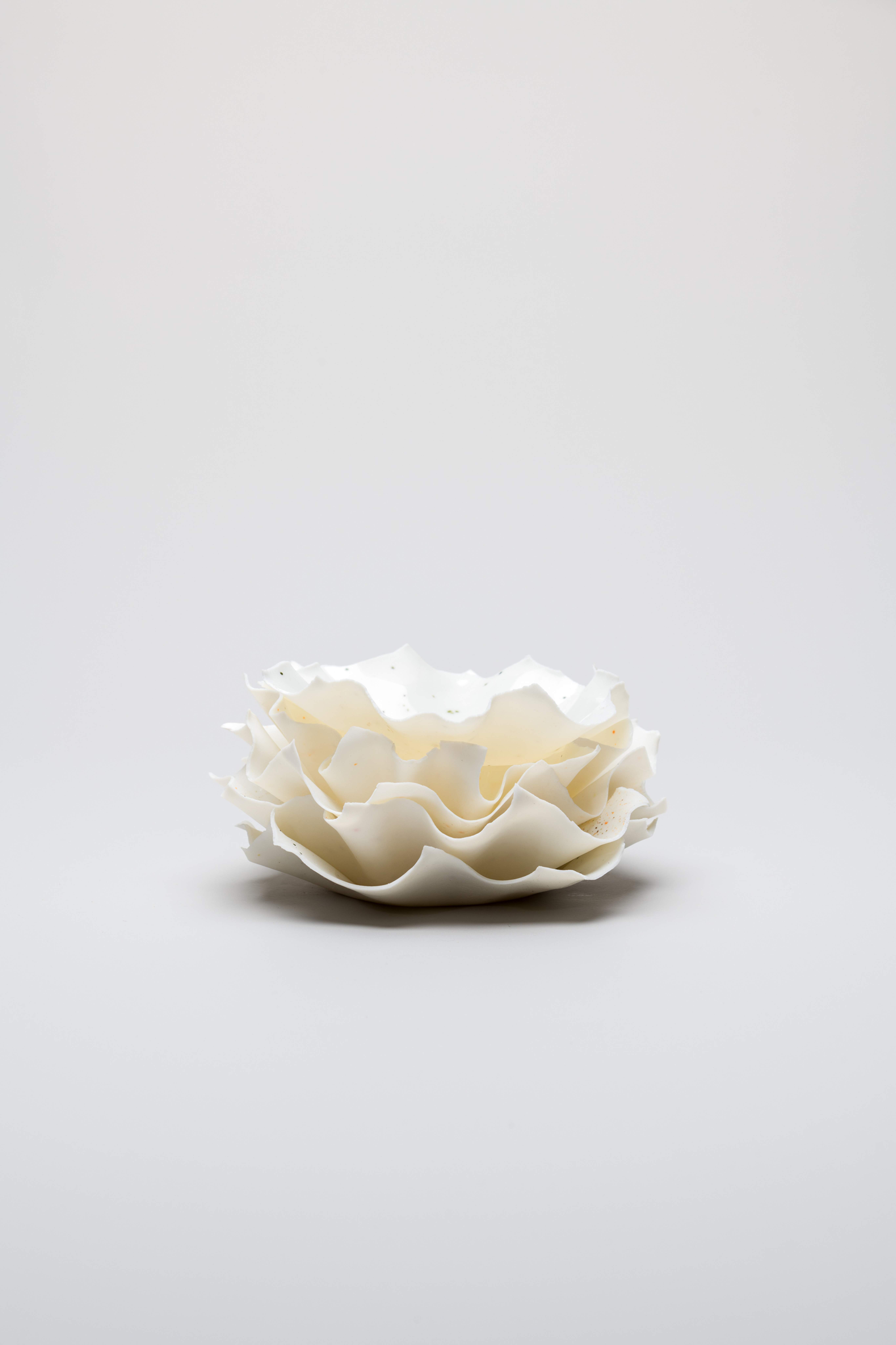 Each piece, crafted with precision, begins as a thin sheet of white porcelain lightly dusted with pigment. Draped over a mould, the material naturally folds into graceful, organic shapes. Once fired, the bowls allow light to pass through, while the addition of transparent glaze highlights their intricate, delicate surfaces.
